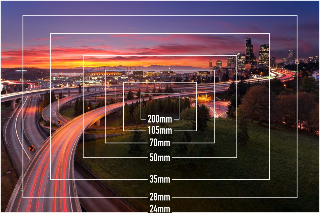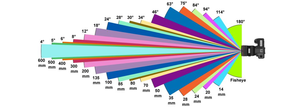 Tu poniżej na zdjęciu pokazuję jaki zakres kadru jest na aparacie z matrycą tak zwaną pełno-klatkową w zależności od długości ogniskowej obiektywu: